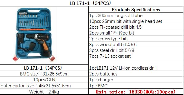 - Product description: LB171-1 12V Cordless Drill Driver set wih Drill Bits
