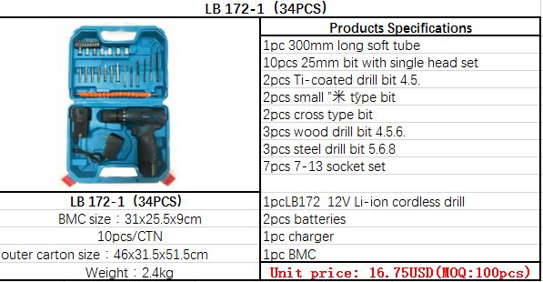 - Product description: LB172-1 12V Cordless Drill Driver set wih Drill Bits