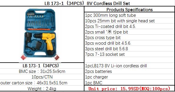 - Product description: LB173-1 8V Cordless Drill Driver set wih Drill Bits
